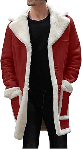 The rich, deep red hue of this men's long coat immediately catches the eye, perfectly complemented by the luxurious white faux shearling trim that lines the collar, cuffs, and front placket. Designed for both striking style and exceptional warmth, this jacket is your ultimate companion for the colder months, especially perfect for holiday gatherings or embracing the festive spirit. Its soft, suede-look exterior feels premium, while the plush faux fur lining offers unparalleled comfort against the skin. Featuring a classic button-front closure and two generous front pockets, also trimmed with the soft shearling, it blends timeless design with practical functionality. This coat isn't just an outer layer; it's a statement piece that promises to keep you cozy and stylish through winter's chill, making every outing feel a little more special. Whether you're heading to a Christmas party or simply enjoying a brisk winter walk, this coat ensures you do so in standout comfort and elegance.
