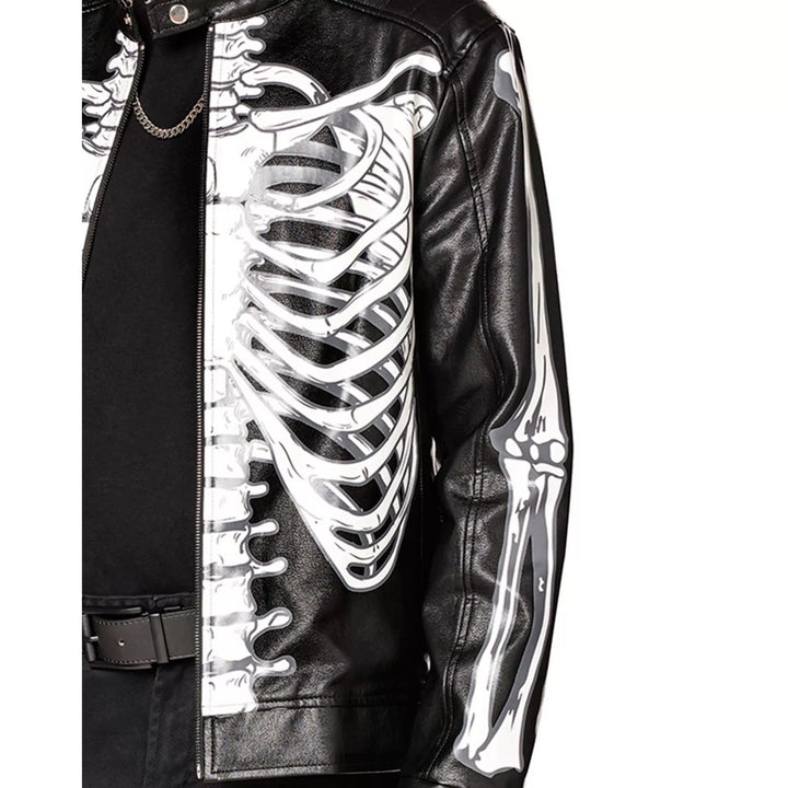 Show off bold skeleton style with the Premium Adult Skeleton Moto Jacket. Featuring striking white bone graphics across the front, arms, and back, this jacket combines edgy fashion with practical design. A front zipper and button neck closure provide secure wear, making it perfect for Halloween, cosplay, or standout everyday style.