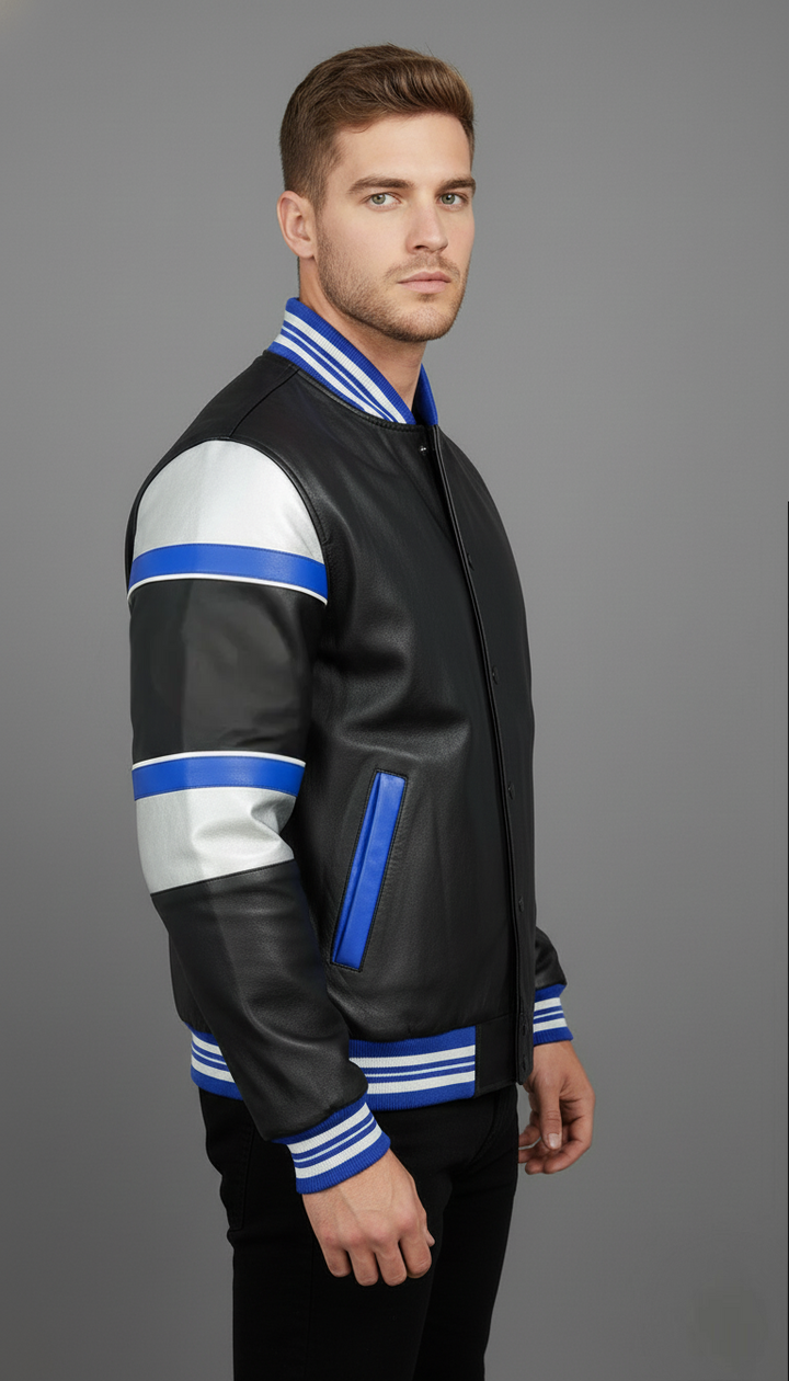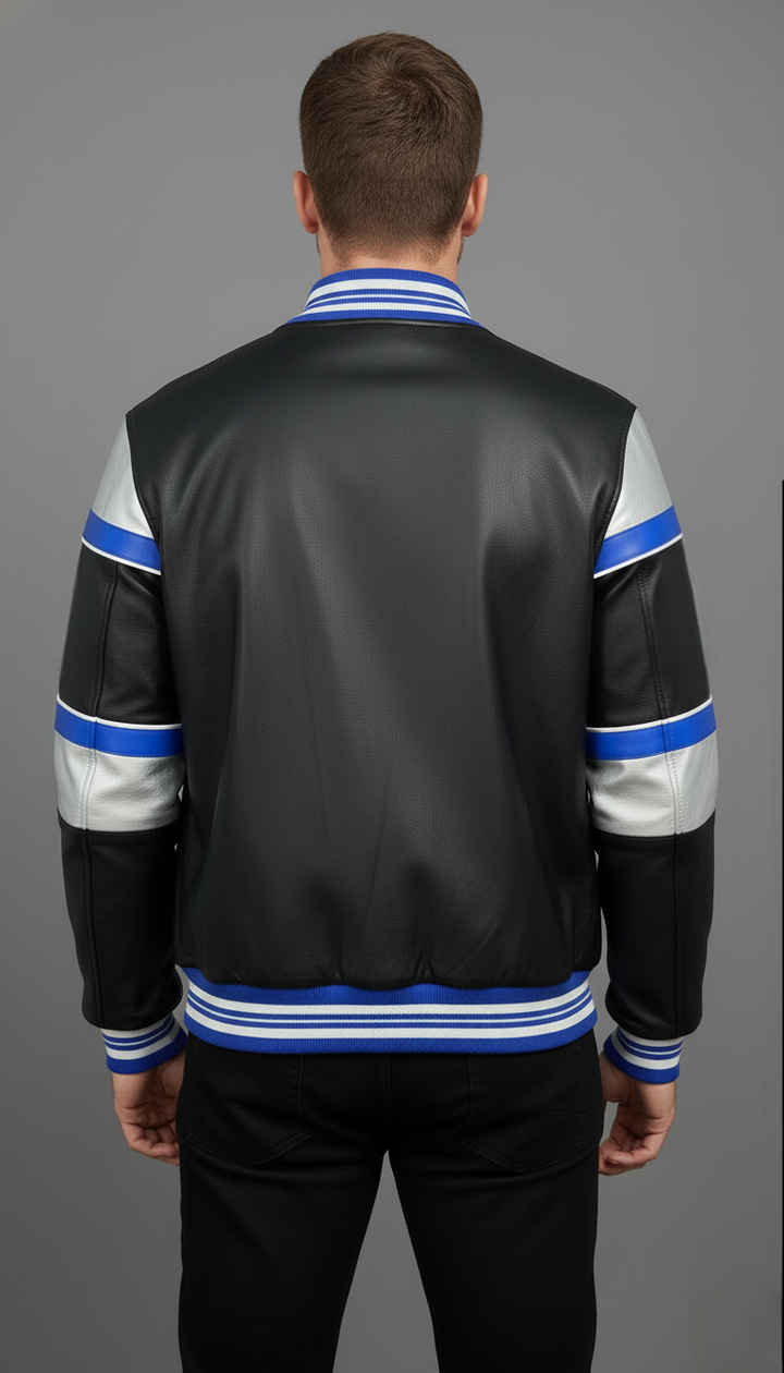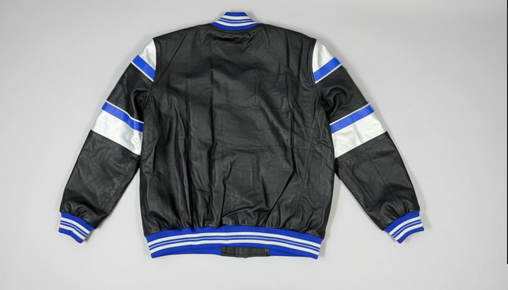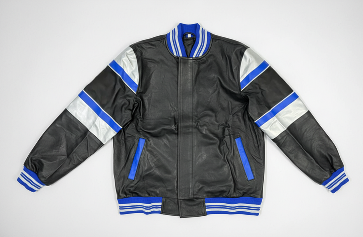 Silver Leather Sleeves with Blue Stripes: Eye-catching silver-tone leather accents on the sleeves, highlighted by vibrant royal blue stripes for a dynamic collegiate or athletic look.