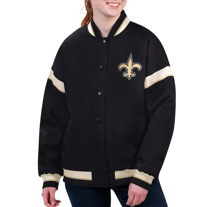 Be a true fan with the NFL New Orleans Saints Varsity Jacket for men and women. Show off your team spirit while staying warm in this stylish jacket. Made with high-quality materials, this jacket boasts the team colors and logo. Perfect for game day or everyday wear.