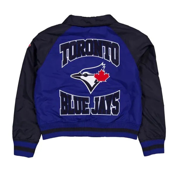 Blue and black varsity jacket with 'Toronto Blue Jays' text on a white background in USA