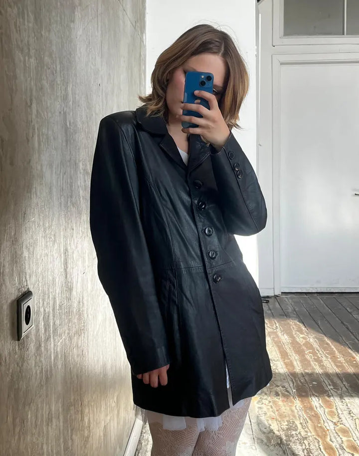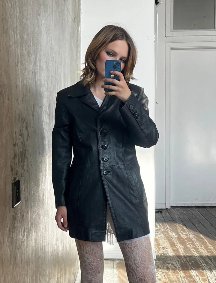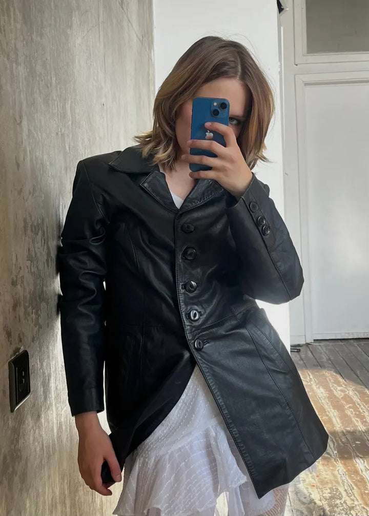 Expertly crafted from high-quality leather, this vintage 90s blazer jacket exudes timeless sophistication. With its classic button-down design and sleek black color, it is a versatile and stylish addition to any wardrobe. Elevate your look and make a statement with this stunning piece.