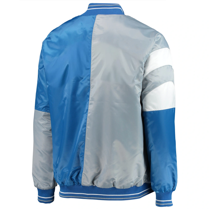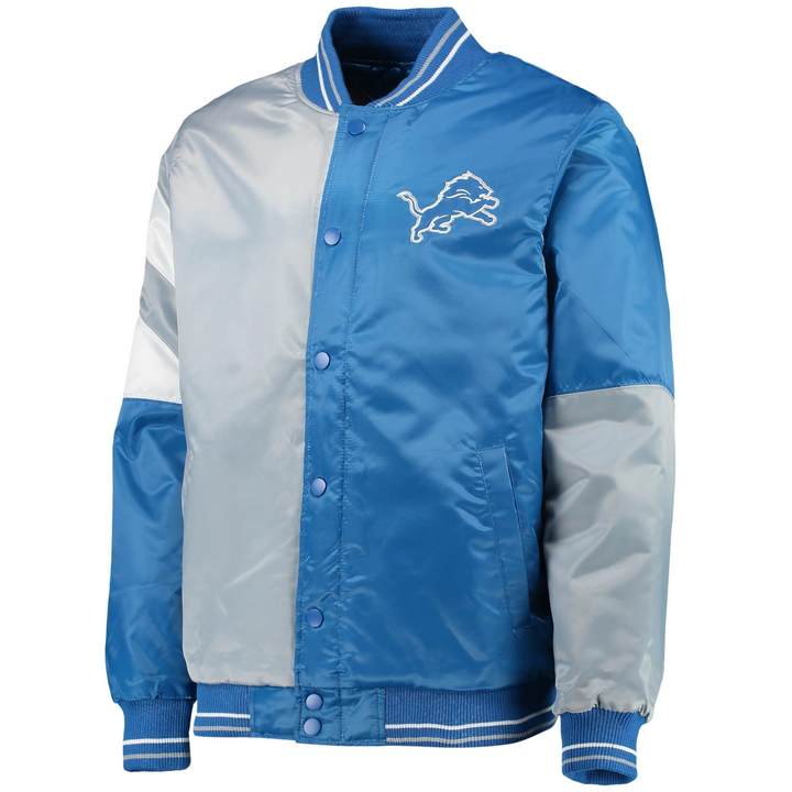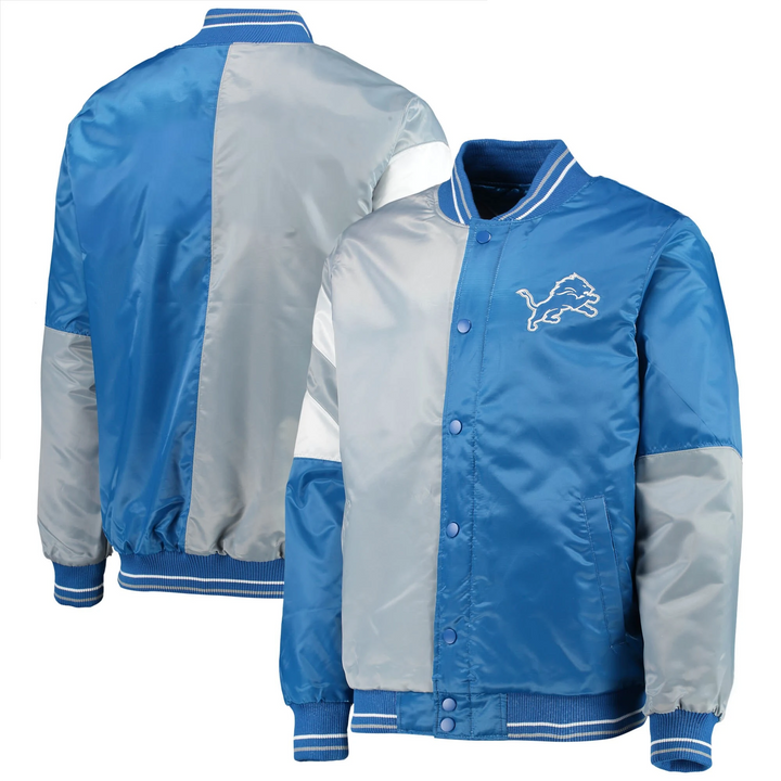 Make a bold statement with the Detroit Lions Leader Blue/Gray Satin Varsity Jacket. This iconic piece blends classic team colors with a sleek satin finish, making it the ultimate game day essential.