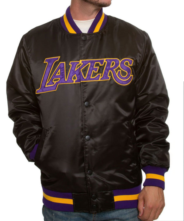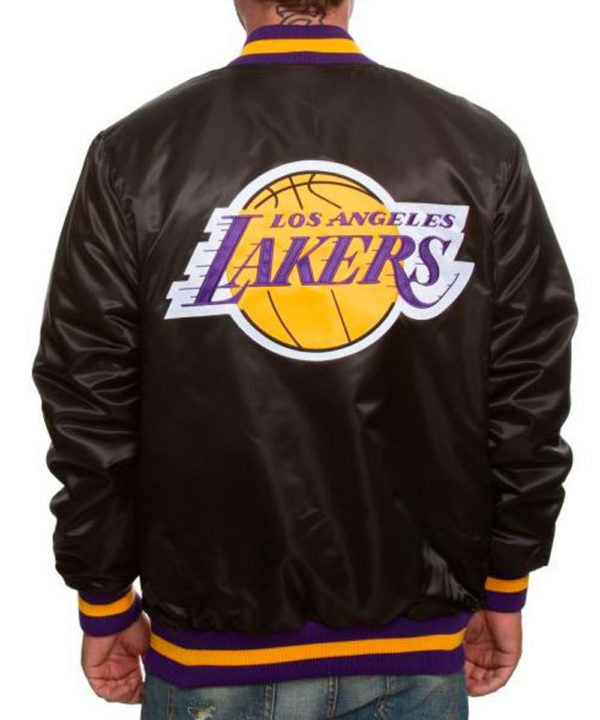 Elevate your style with the Lakers Bomber Jacket for Men, a must-have for every Los Angeles Lakers fan. Crafted from premium satin, this jacket is designed to make a statement with its sleek black color and bold detailing.