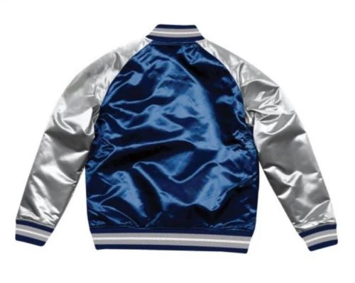 This New England Patriots varsity jacket exemplifies premium heritage sportswear craftsmanship. The navy blue satin construction delivers exceptional luster and durability while authentic team insignia are executed with meticulous precision. this jacket features superior quality components and traditional varsity styling. An elite collectible that satisfies discerning enthusiasts seeking the definitive expression of Patriots team identity with uncompromising attention to detail.
