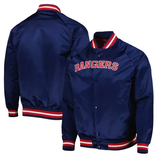 Crafted from premium satin, this New York Rangers Navy Satin Jacket offers a sleek and comfortable fit, perfect for true fans. It features a full-snap front, stripe rib-knit collar, cuffs, and hemline for a snug feel. The jacket's standout design includes fabric applique team lettering and logos on the chest, adding an authentic touch. With two side slip pockets and two interior pockets, it's as functional as it is stylish.