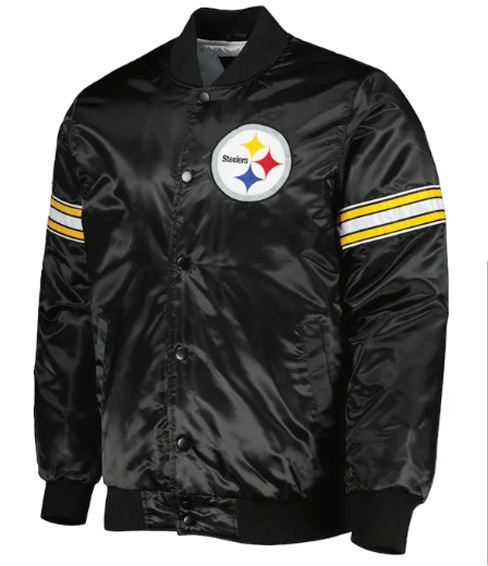 Stand out in true Steelers style with this sleek black satin jacket, featuring the iconic Pittsburgh Steelers logo. It’s the perfect blend of classic fan pride and modern streetwear appeal.