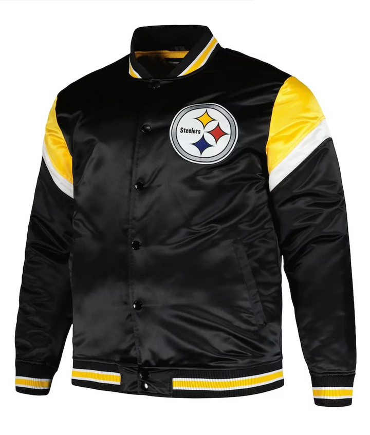 Show your Steelers pride with this sleek midweight black satin jacket. Designed for comfort and style, it features a soft lining and embroidered team logos.