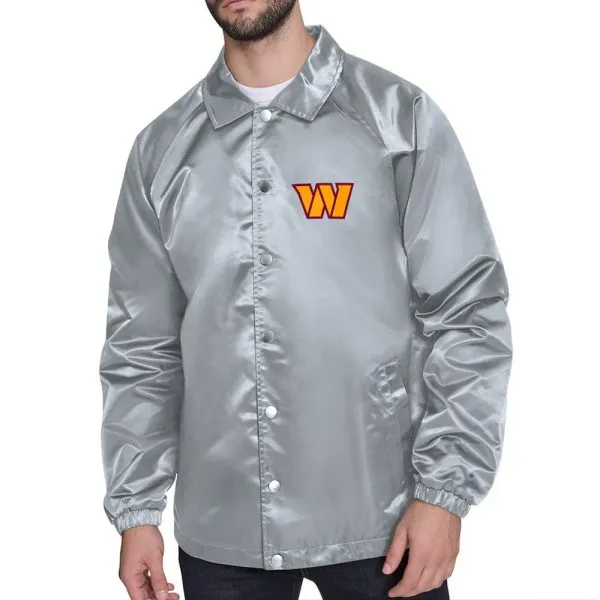 Upgrade your fan wardrobe with the Washington Commanders Printed Logo Raglan Gray Coaches Jacket, brought to you by The Jacket Seller. This branded jacket is a standout creation crafted from premium satin, with a soft viscose lining underneath for ultimate comfort and insulation.