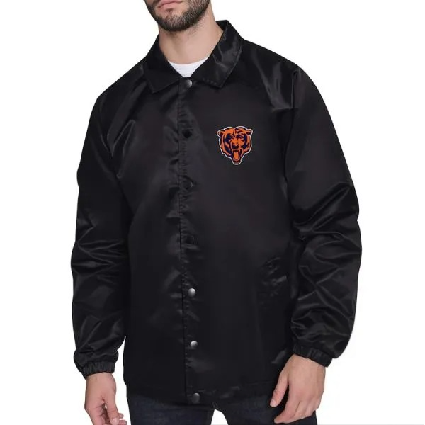 Elevate your sideline swagger with the Chicago Bears Retro Logo Coaches Jacket, a perfect blend of timeless athletic style and modern-day comfort. Crafted from premium satin in a deep navy blue, this jacket showcases a sleek, glossy finish that reflects true Bears pride. The smooth viscose lining ensures a lightweight yet cozy feel for year-round wear.