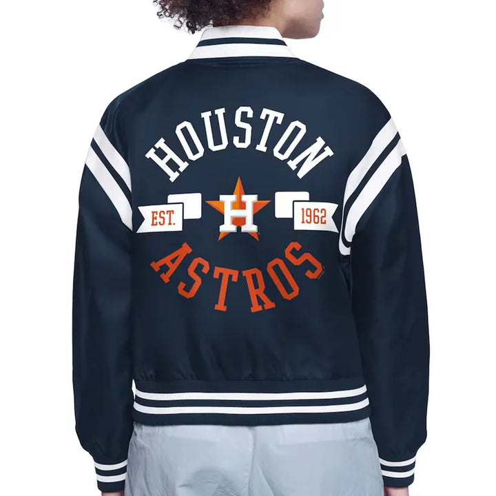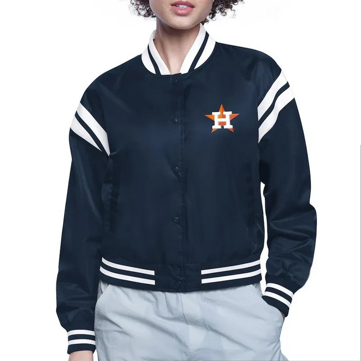 Step into game day style with the Houston Astros Printed Logo Varsity Satin Jacket a standout piece designed for true fans who want to rep their team in comfort and flair. Perfect for both men and women, this unisex jacket is where classic varsity charm meets bold team pride.
