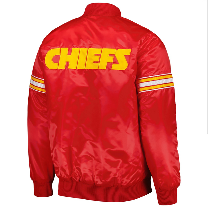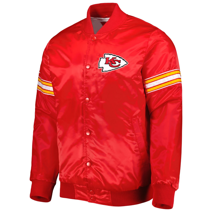 Make a bold statement on game day with the Kansas City Chiefs Red The Pick & Roll Satin Varsity Jacket. Featuring vibrant red satin, iconic Chiefs branding, and classic varsity styling, it's a must-have for true fans.