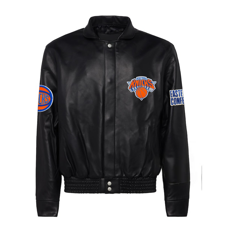 Show off your team pride in style with this premium New York Knicks leather jacket. Made from high-quality leather, it features bold Knicks logos and standout detailing that captures the true spirit of New York basketball. Designed for die-hard fans and collectors, this limited-edition piece offers long-lasting durability and a polished look that never goes out of style.