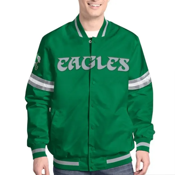 Elevate your style with the Philadelphia Eagles Vintage Scout Jacket, a must-have for fans of branded jackets. Expertly crafted by The Jacket Seller, this outerwear boasts a premium satin exterior paired with a moisture-proof viscose lining for unmatched comfort. With its vibrant green, gray, and white color scheme, this jacket mirrors the appeal of a classic green leather jacket.
