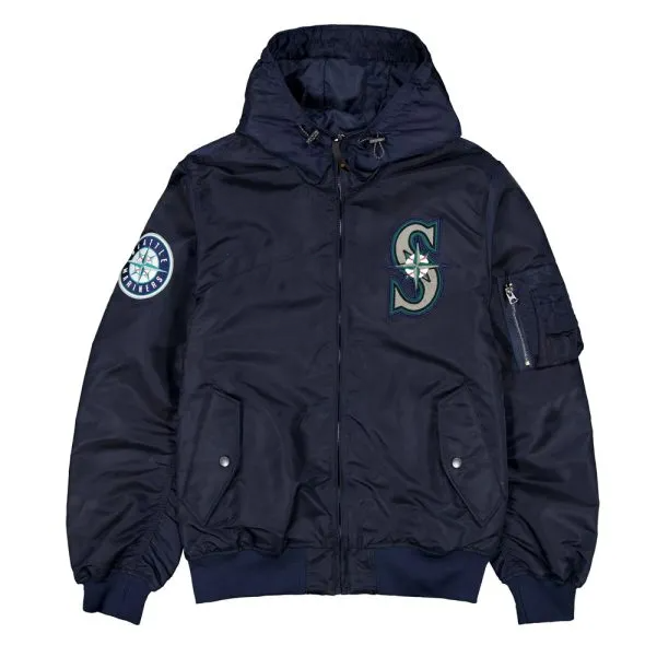 Crafted from real satin with a smooth viscose lining, the Seattle Mariners Historic L-2B jacket offers a stylish and comfortable fit. Featuring a classic hooded collar with a drawstring, full zip-up front, ribbed cuffs and hem, and long sleeves, this jacket combines fashion and function. It includes two outer flap buttoned pockets, a utility pocket on the left sleeve, and two inner pockets for convenience. The navy blue color adds to its sleek look, making it a must-have for any fan.