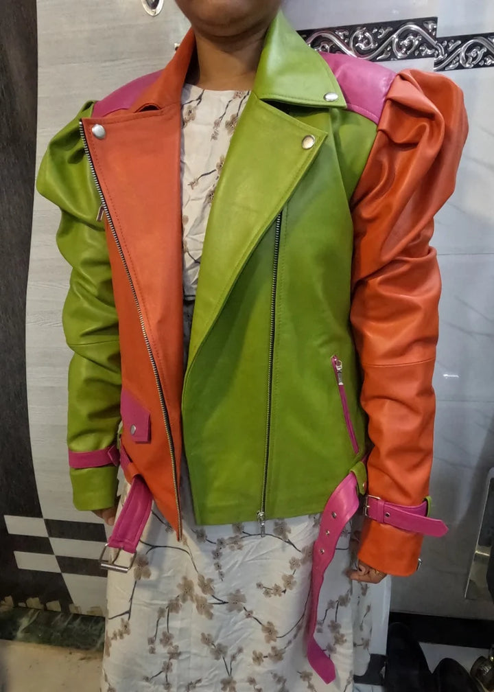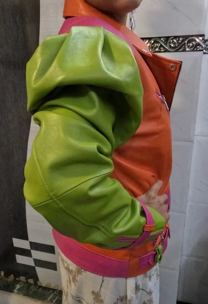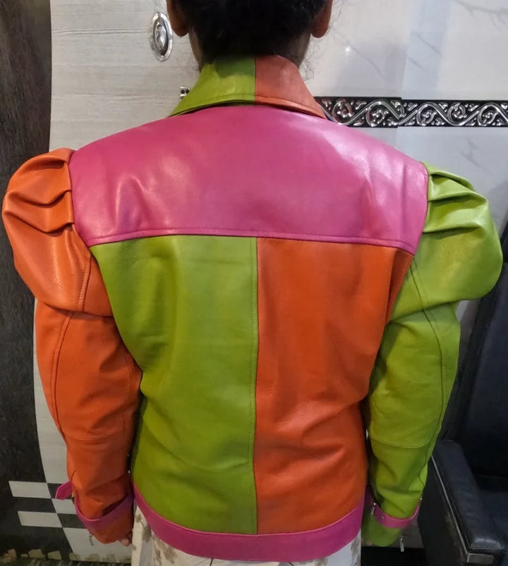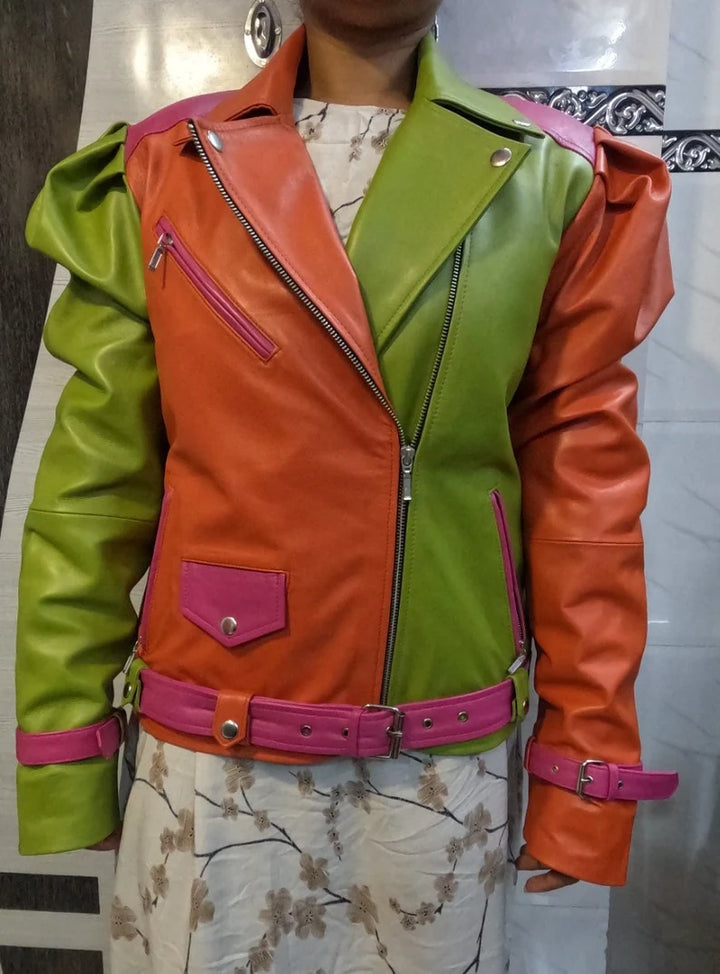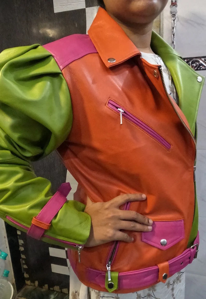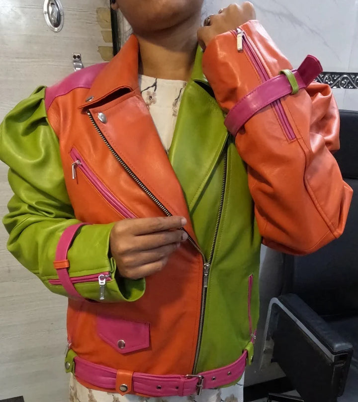 Women's Lambskin Orange, Pink & Green Leather Biker Jacket